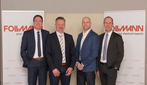 Dr. Jörg Seubert, Geschäftsführer Follmann, André Kapsa, Geschäftsführer com2C, Christoph Kellermeier, Anwendungstechniker com2C und Dr. Heiko Warnecke, Director Business Unit Functional Solutions Follmann (v.l.n.r.)