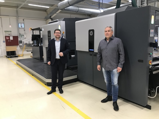 Die neue HP 20000 erweitert die Möglichkeiten von Labelprint24 und unterstützt die Produktvielfalt. Von links: Thorsten Glaab, HP Indigo Key Account Manager und Stefan Harder, Geschäftsführer Labelprint24 (Quelle: HP)