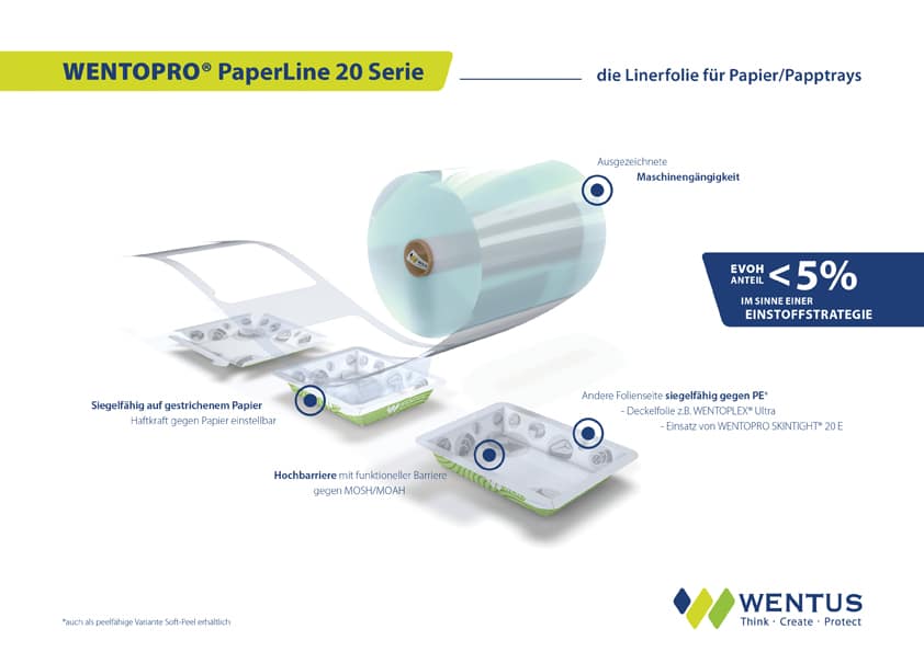Wentropro PaperLine 20 ist eine Barrierefolie, die als Liner für Papier- oder Kartontrays eingesetzt wird. Sie ist auf einer Seite siegelfähig gegen gestrichenes Papier und lässt sich in ihrer Haftkraft gegenüber dem Faserstoff einstellen. Ihre Hochbarriere gegen MOSH/MOAH bietet einen Schutz gegen die Migration von Mineralölkomponenten aus Druckfarben. Die andere Folienseite ist auf eine feste Siegelung gegen PE-Materialien ausgerichtet, damit der mit der Linerfolie ausgelegte Kartontray hermetisch mit einer Oberfolie versiegelt werden kann. Dafür eignen sich z. B. Produkte aus dem Wentus Sortiment, z. B. die recycelbare und dünne Deckelfolie Wentoplex Ultra oder die neue hochglänzende Skinfolie Wentropro Skintight 20 E. Gemäß der Einstoffstrategie zur optimalen Recyclingfähigkeit beträgt der EVOH-Anteil von Wentropro PaperLine 20 weniger als fünf Prozent. Die Linerfolie ist in Stärken von 100 und 150 µm erhältlich.