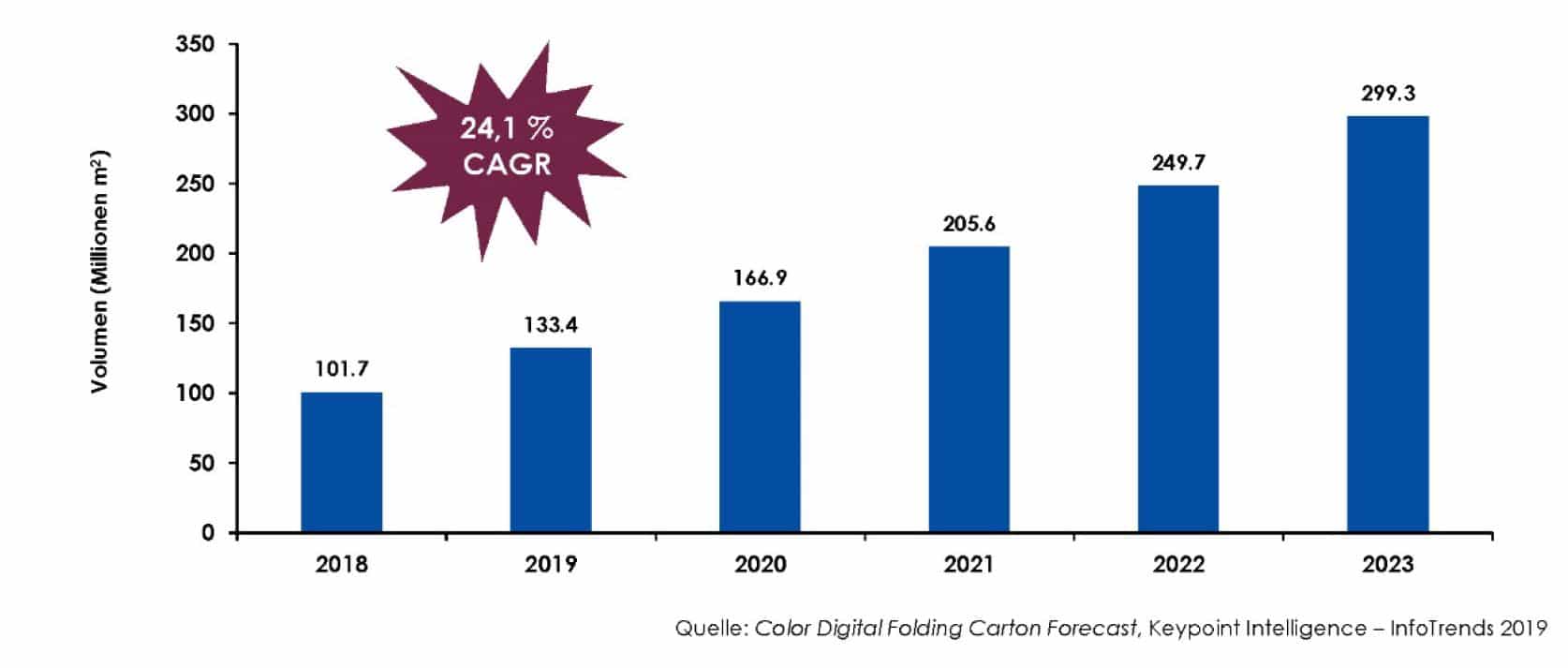 Weniger als 1 % der flexiblen Verpackungen wird derzeit digital produziert, d. h., die Chancen für ein zukünftiges Wachstum sind enorm. Laut Prognosedaten von Keypoint Intelligence – InfoTrends wurden weltweit 2018 fast 102 Mio. Quadratmeter farbige flexible Verpackungen hergestellt. Es wird erwartet, dass es bis 2023 300 Mio. sein werden, was einer durchschnittlichen jährlichen Wachstumsrate (CAGR, Compound Annual Growth Rate) von 24,1 % entspricht.