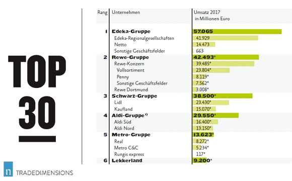 Nach Aussage der Fachzeitschrift zeigt sich an der Tabellenspitze im Vergleich zu 2016 zwar wenig Bewegung, aber deutlich wird: Konzentration und Marktmacht nehmen weiter zu. Angeführt wird das von Trade Dimensions erstellte Ranking von der Edeka-Gruppe, gefolgt von der Rewe-Gruppe.