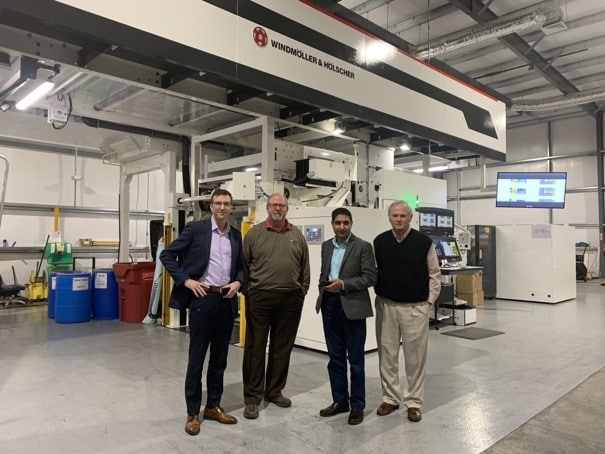 Die neue Miraflex II im Produktionswerk der Zim's Bagging Company in Prichard, West Virginia/USA. Von links: Andrew Wheeler (W&H), Kevin Worthy (Zim's), Javeed Buch (W&H) und Harry Zimmerman (Zim's) (Quelle: W&H)