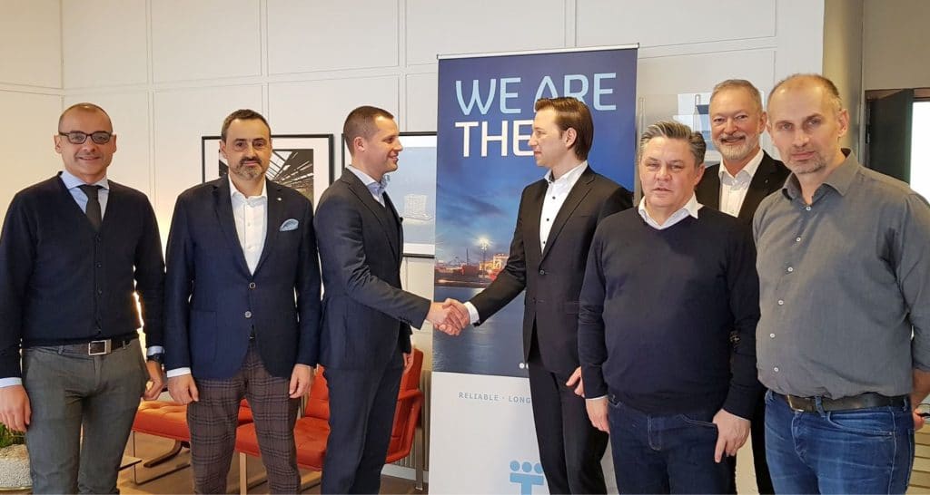 Feiern den erfolgreichen Abschluss des Evo XG 8 LR Projekts (von links nach rechts): Massimo Forletto, Koenig & Bauer Flexotecnica; Andrea Dallavalle, Koenig & Bauer Flexotecnica; Oskar Karlsson, Trioplast; Joachim Barthelme, Koenig & Bauer Flexotecnica; Richard Warnick, Koenig & Bauer UK; Håkan Rundén, Koenig & Bauer DK und Dario Simic, Trioplast; Niels Petersen, Trioplast (nicht im Bild)