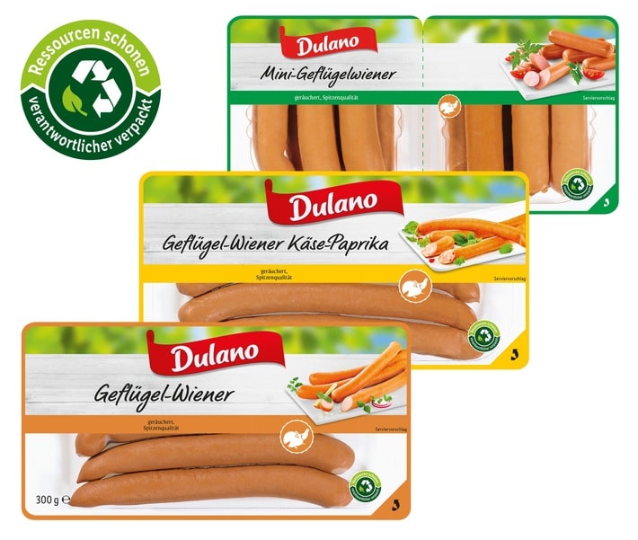 Pro Packung der "Dulano"-Geflügel-Wiener in den Sorten Wiener, Wiener Käse-Paprika sowie Mini-Wiener spart Lidl aufgrund der Verwendung einer dünneren Unterfolie 16,3 Prozent Plastik