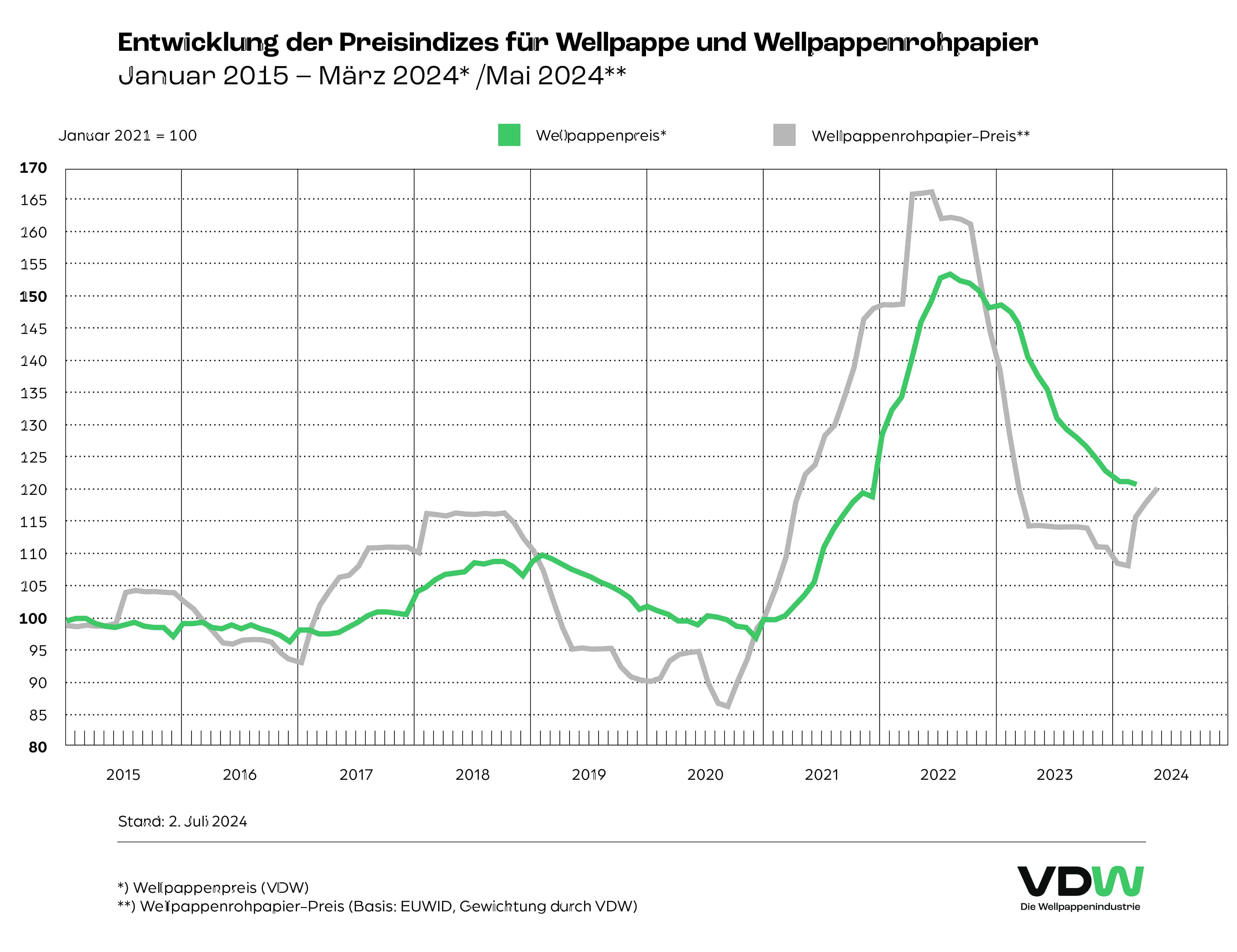Größter Treiber sei hier der Preis für Wellpappenrohpapier, dem wichtigsten Rohstoff für die Herstellung von Wellpappe. Altpapierbasierte Sorten machen dabei mit über 80 Prozent den größten Anteil der von den VDW-Mitgliedern eingesetzten Papiere aus. Das vom VDW berechnete gewichtete Gesamtpreisniveau für braune altpapierbasierte Sorten ist von Januar bis Mai 2024 um 14,9 Prozent gestiegen. Nach Angaben von EUWID (Europäischer Wirtschaftsdienst GmbH) ist der Durchschnittspreis für Wellenstoff (altpapierbasiert) im ersten Halbjahr sogar um 18,9 Prozent und der für Testliner 3 (altpapierbasiert) um 18,5 Prozent gestiegen.