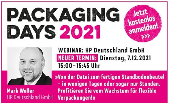 Wie man flexible Verpackungen im Digitaldruck produzieren kann, erklärt Mark Weller (HP) in seinem Online-Seminar „Von der Datei zum fertigen Standbodenbeutel“ am Dienstag, den 7. Dezember 2021 von 15:00 bis 15:45 Uhr. Die Teilnahme ist kostenlos.