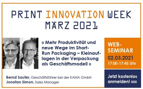 Wie produziert man im Verpackungsmarkt eine große Produktvielfalt und das in kleinen Liefereinheiten und bei anspruchsvollen Time-to-Market-Anforderungen der Kunden? Das geht nur mit schnellen Auftragswechseln im Postpress. Dazu braucht man vielseitige Lösungen und automatisierte Abläufe. Welche Möglichkeiten es hier gibt, illustriert ein Web-Seminar von KAMA. Dabei werden Ihnen die Maschinen im Democenter vorgeführt. Erleben Sie die Referenten Bernd Sauter und Jonatan Simon im Rahmen der PRINT INNOVATION WEEK am Dienstag, den 2. März, von 17:00 bis 17:45!