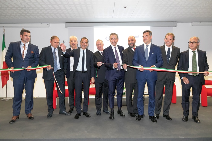 Eröffnung der 2018 erstmals veranstalteten Print4All, die eine Fusion der bisherigen Messen Grafitalia, Converflex und Inprinting ist. Von links nach rechts: Andreas Züge (Hannover Messe), Aldo Peretti (Acimga), Roberto Levi Acobas (Argi), Giuseppe Sala (Bürgermeister von Mailand), Alessandro Grassi (Amaplast), Riccardo Cavanna (Impack-Ima), Enrico Aureli (Ucima), Fabrizio Curci (Messe Mailand), Giovanni Gorno Tempini (Messe Mailand) und Michele Scannavini (ICE)