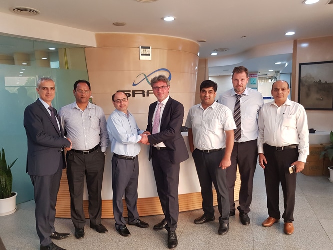 V. r. n. l.: Amir Rezai (Senior Sales Manager KAMPF), Hari K. Singh (Executive Vice President & Head Global Operations), Prashant Mehra (President & CEO, Packaging films Business), Lutz Busch (CEO KAMPF), Jai P. Chauhan (Senior Project Manager SRF), Markus Vollmer (Sales Director KAMPF), Ajay Sharma (General Manager Sales Kampf India) (Quelle: Kampf)