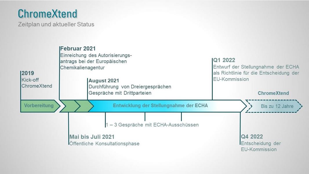 Nachdem K.Walter im Februar 2021 den Autorisierungsantrag bei der ECHA eingereicht hat, wurde der Antrag in der Zwischenzeit bearbeitet und in verschiedenen ECHA Gremien behandelt. Es fand dabei zu verschiedenen Zeitpunkten ein konstruktiver Austausch zwischen Kaspar Walter und der ECHA statt und letzte inhaltliche Fragen konnten von Seiten Kaspar Walters erfolgreich beantwortet werden. Erste Diskussionen zu den Betriebsbedingungen und Maßnahmen zur Risikominimierung zeigten, dass die ECHA die hohen Prozessstandards und Sicherheitsmaßnahmen in der Tiefdruck- und Prägegalvanik für glaubwürdig und ausreichend sieht.