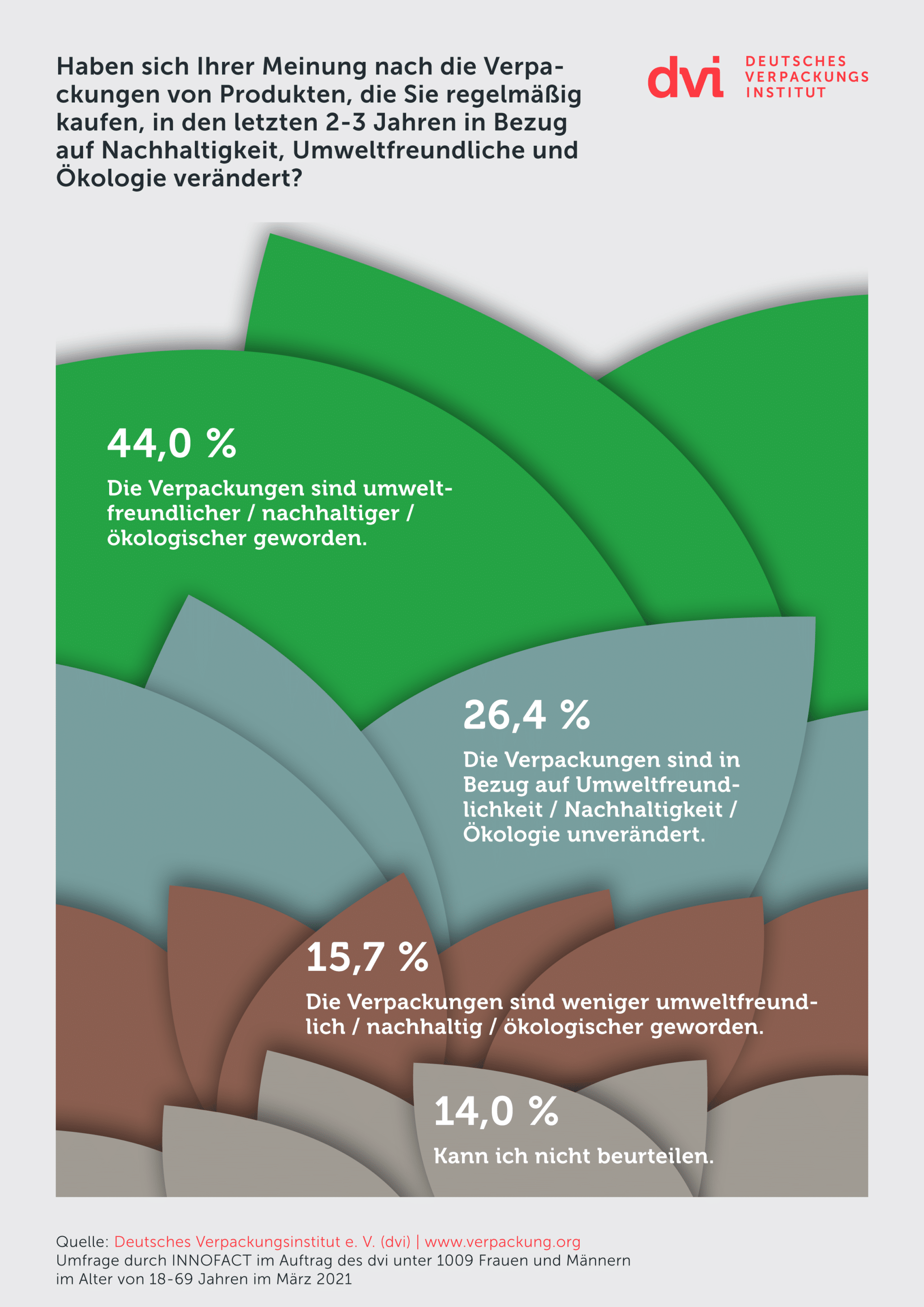 Aktuelle Ergebnisse einer repräsentativen Bevölkerungsbefragung im Auftrag des Deutschen Verpackungsinstituts e. V. (dvi) zeigen, dass die zahlreichen Innovationen der vergangenen Jahre im Bereich nachhaltiger Verpackungen bei den Verbrauchern ankommen ist. Mit 44,0 Prozent attestiert rund die Hälfte der Befragten den Verpackungen klare Fortschritte bei der Umweltfreundlichkeit, nur 15,7 Prozent sehen Rückschritte. Mit 74,6 Prozent bestätigen darüber hinaus Drei von Vier Befragten, dass diese Fortschritte ohne Abstriche oder sogar mit Fortschritten bei Funktionalität und Convenience erreicht wurden. Das dvi empfiehlt ungeachtet dessen weitere Maßnahmen zur Umsetzung der Kreislaufwirtschaft bei Verpackungen und den Einsatz von objektiven Ökobilanzen zur Bewertung von Nachhaltigkeit.