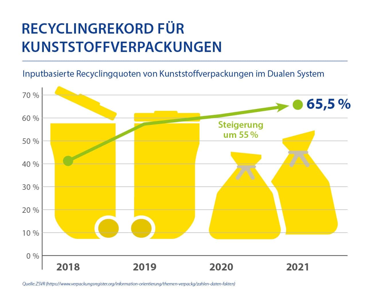 Das werkstoffliche Recycling von Kunststoffverpackungen im Dualen System hat ein neues Rekordniveau erreicht. Wie die Zentrale Stelle Verpackungsregister kurz vor Jahresende 2022 bekannt gab, wurde im Jahr 2021 eine werkstoffliche Recyclingquote von 65,5% erreicht – ein Plus von 5% gegenüber dem Vorjahr.