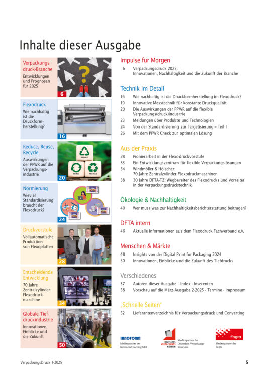 Flexodruck: Wie nachhaltig ist die Druckformherstellung? +++ Reduce, Reuse, Recycle: Auswirkungen der PPWR auf die Verpackungsindustrie +++ Normierung: Wieviel Standardisierung braucht der Flexodruck? +++ Druckvorstufe: Vollautomatische Produktion von Flexoplatten +++ Entscheidende Entwicklung: 70 Jahre Zentralzylinder-Flexodruckmaschine +++ Globale Tiefdruckindustrie: Innovationen, Einblicke und die Zukunft21,90 €