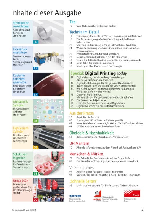 Drupa 2024: Die weltweit größte Messe für Drucktechnologie startet +++ Strategische Ausrichtung: Vom Klebebandhersteller zum Partner +++ Flexodruckmaschinen: Zusatzdruckwerke für Veredelungen mit Mehrwert +++ Kubische Lamellengeometrie: Neue Rakel sorgt für stabilen Liniendruck +++ Digitalduck-Systeme: Die Anzahl der Anbieter steigt rasant +++ Lightweight-Zylinder: Drucktest unter erschwerten Bedingungen