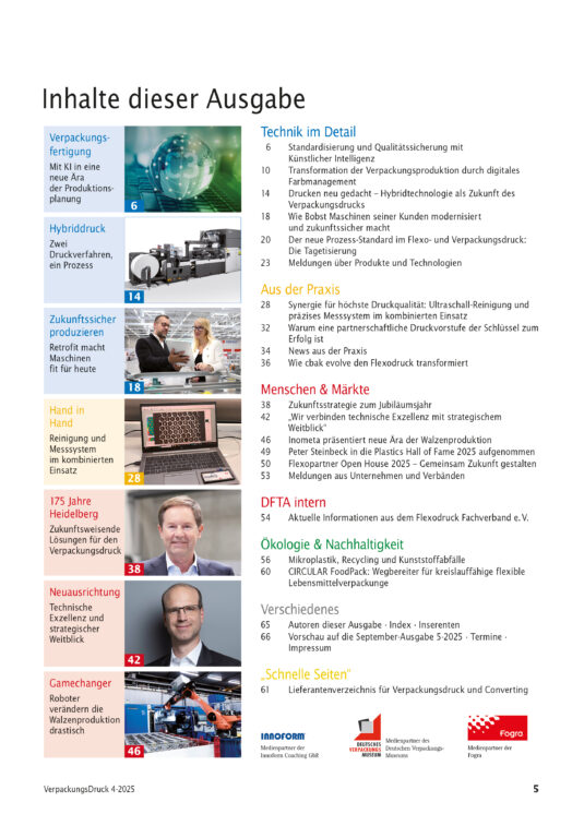 Verpackungsfertigung: Mit KI in eine neue Ära der Produktionsplanung +++ Hybriddruck: Zwei Druckverfahren, ein Prozess +++ Zukunftssicher produzieren: Retrofit macht Maschinen fit für heute +++ 175 Jahre Heidelberg: Zukunftsweisende Lösungen für den Verpackungsdruck +++ Neuausrichtung: Technische Exzellenz und strategischer Weitblick +++ Gamechanger: Roboter verändern die Walzenproduktion drastisch- Download
