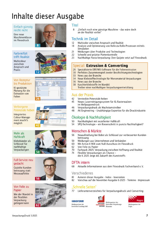 Einfach günstig reicht nicht: eine neue Maschinenklasse im Flexodruck +++ Farbvielfalt trifft Realität: Multicolour zwischen Anspruch und Praxis +++ Von Rezeptur bis Produktion: KI-gestützte Planung für die Extrusion von Folien +++ Full-Service neu gedacht: gezielte Kundenbetreuung statt Messeauftritte +++ Verborgene Potenziale heben: integriertes Colour-Management macht’s möglich +++ Mehr als Haftkraft: Klebebänder als Schlüssel für nachhaltige Verpackungen
