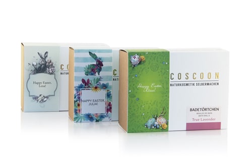Die Online-Konfiguration hatte Pfäffle Verpackungen eigens für die Osteraktion programmiert. Nach Abschluss der Aktion, knapp eine Woche vor den Osterfeiertagen, begann die Produktion der individuellen Verpackungen. Die Ostergrüße druckte die Pfäffle GmbH im Digitaldruck ein und verlieh ihnen damit den letzten Schliff. Pünktlich zum Osterfest landeten die Kits dann bei ihren Empfängern. Im Innern der Verpackung: Ein Do-It-Yourself-Kit zur Herstellung der Badetörtchen von Coscoon Cosmetics. Für das Beauty Label, das erst kürzlich den “Best New Product 2018 Award” gewann, hatte rlc zusammen mit weiteren Partnern im vergangenen Jahr das Verpackungskonzept überarbeitet und produziert.