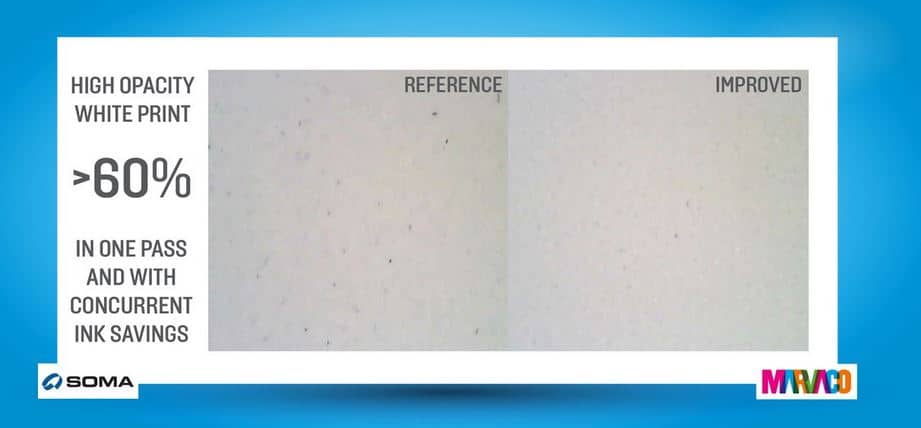 Das von Marvaco und SOMA angeführte Projekt wurde eine BOPP-Folie rückseitig, flächig mit Weiß bedruckt. Es konnte eine Opazität von über 60% erreicht werden. Zur Anwendung kamen dabei die neuesten Technologien der vier Partner, welche mit nur einem Druckwerk bei reduzierter Auftragsmenge (geringes Schöpfvolumen der Rasterwalze, optimierte Formulierung der Weiß-Farbe) in mehreren Testläufen schließlich diese hohe Weiß-Opazität erzielten.