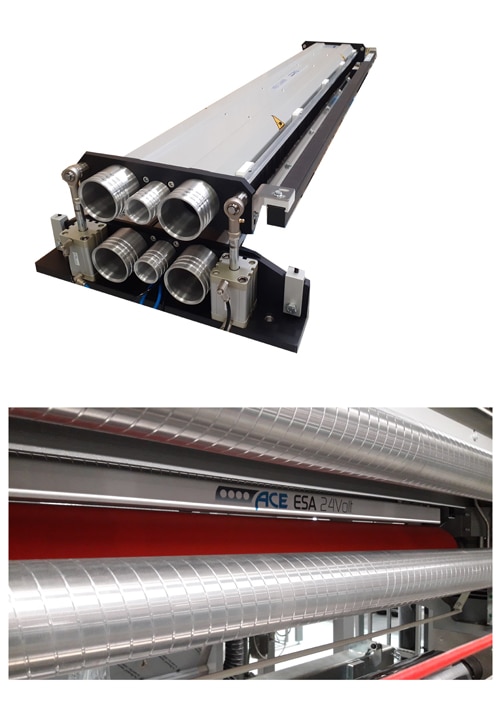 Italian company ACE designs and manufactures electrostatic devices and systems, static elimination bars, ionized air blowers, electrostatic charging bars and web cleaning systems. Thanks to its great experience in the field, they offer a series of accessoriy systems to production. Among these the ESA electrostatic print assist for gravure printing stands out, in both its versions hybrid and full 24Volt. In addition, the company also gained reputation for its web cleaning and de-dusting systems.