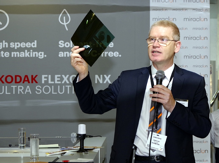 Chris Payne, CEO von Miraclon, bei der Vorstellung der neuen Kodak Flexcel NX Ultra Lösung auf dem Labelexpo-Stand von Miraclon (Quelle: Miraclon)