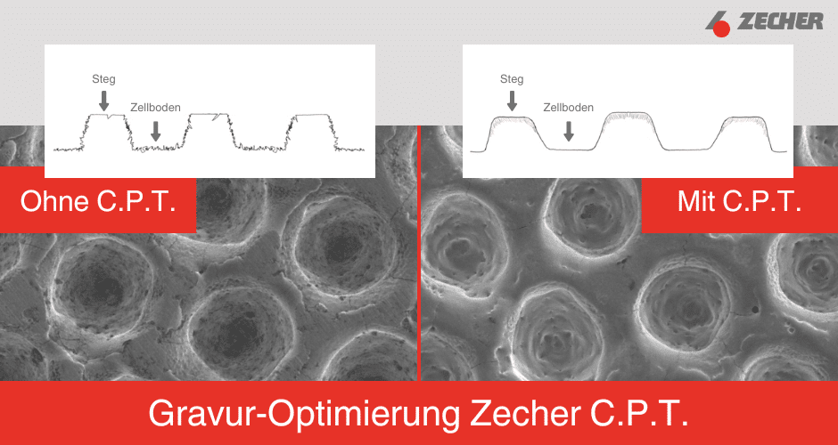 Zecher C.P.T. ist ein thermischer Nachbearbeitungsprozess, der nach der Lasergravur angewendet wird. Durch diesen Prozess werden submikroskopische Unebenheiten wie Poren und Nano-Risse thermisch entfernt. Dies führt zu einer glatteren Zellstruktur und einer verbesserten mechanischen Stabilität der Walzenoberfläche.