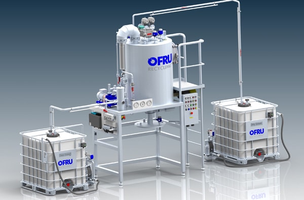 Zur Lösung dieses Problems hat Ofru Recycling ein umfassendes, aus mehreren Bausteinen bestehendes und kundenspezifisch konfigurierbares Konzept zur Lösemittelaufbereitung im Programm. Ausgangspunkt ist zunächst das verschmutzte Lösemittel im entsprechenden Tank an der Druckmaschine. Das „Ofru-Integration-Kit“ wird direkt an der Druckmaschine platziert und mit dessen Hilfe das verschmutze Lösemittel zum Ofru-Sammeltank transportiert. Ausgestattet mit einem Füllstandsensor puffert er das im Auflagendruck anfallende Schmutzlösemittel und stellt somit eine kontinuierliche Destillation sicher.