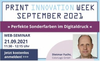 Ihre Kunden erwarten, dass auch im Digitaldruck Sonderfarben bestmöglich wiedergegeben werden. Wie das funktioniert, erläutert Dietmar Fuchs (ColorLogic GmbH) in seinem Web-Seminar “Perfekte Sonderfarben-Wiedergabe im Digitaldruck” am Dienstag, den 21. September 2021, von 11:30 Uhr bis 12:15 Uhr.